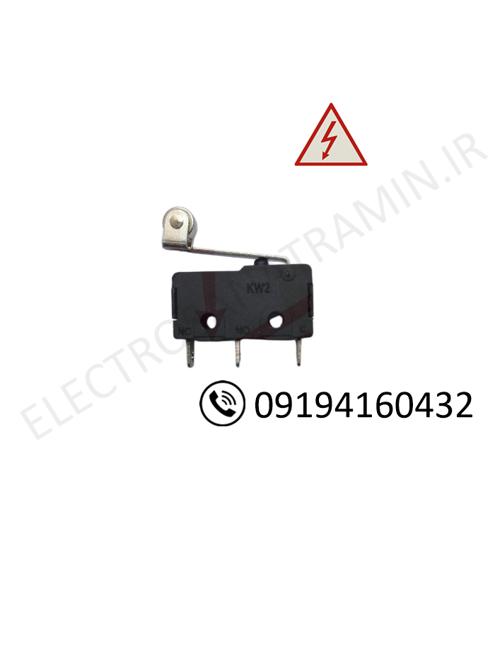میکروسوئیچ با اهرم و قرقره (Roller Lever Microswitch).تعداد پایهها: سه پایه (Common-C, Normally Open-NO, Normally Closed-NC).
