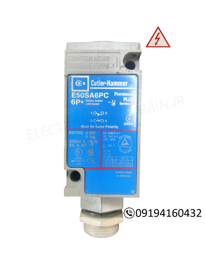 مدل E50DR1E50DR1 یک سوئیچ هد Operating Head از سری Heavy‑Duty Plug‑In محدودیت (E50) شرکت Eaton (قبلاً Cutler‑Hammer) است. این مدل شامل تنها قسمت Head است و بدنه (Switch Body) و اکتواتور جدا هستند. نوع اکتواتور: Side Rotary با بازگشت فنری استاندارد و مسیر حرکت عملیاتی حداکثر ۵° برای فعالسازی تماسها، و بازگشت حدود ۲° . محل نصب از سمت بغل و قابل نصب در چهار جهت رزوهدار، قابل چرخش CW یا CCW بدون ابزار اضافی است .