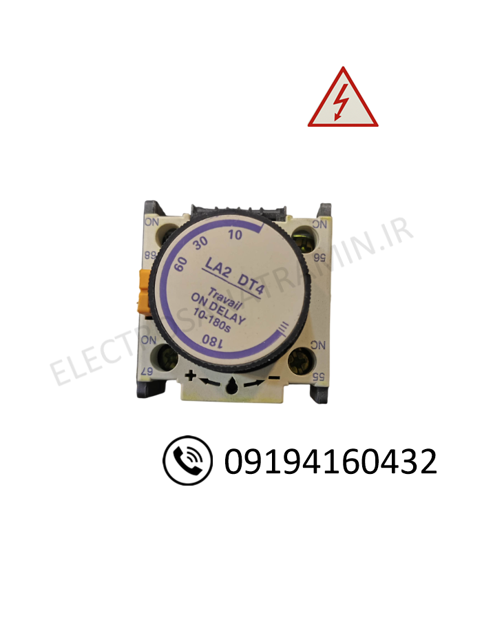 تایمر LA2-DT4 یه تاخیر زمانی در وصل (ON DELAY) هست؛ یعنی وقتی برق به بوبین کنتاکتور میرسه، بلافاصله عمل نمیکنه — بلکه بعد از گذشت زمان تنظیمشده (مثلاً 10 تا 180 ثانیه) کنتاکتور رو وصل میکنه.