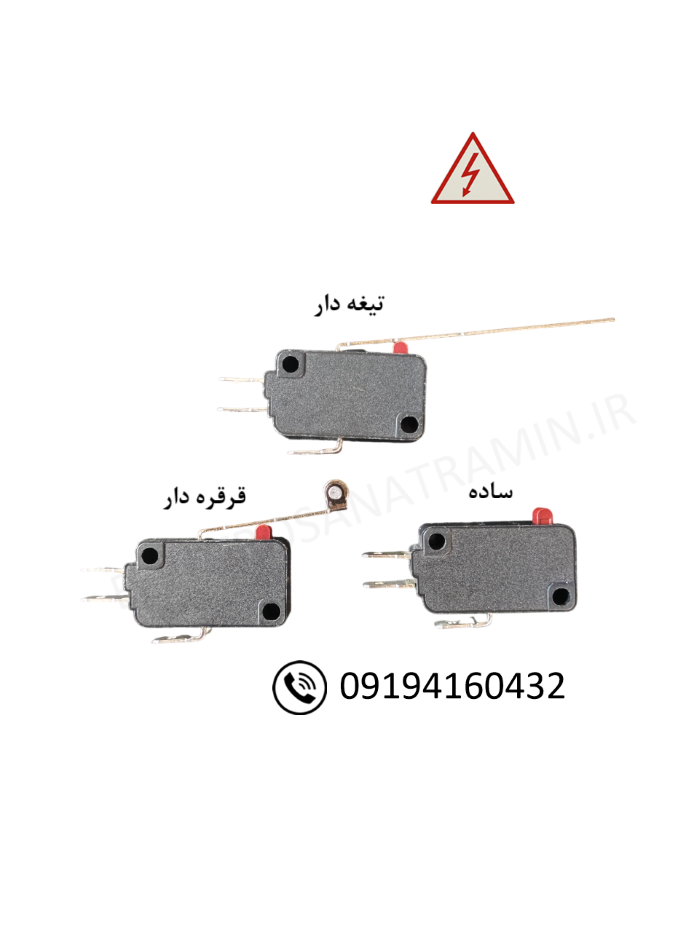 - Micro Switch (Lever Type) : میکروسوئیچ کوچک با مکانیزم اسنپ-اکشن (Snap Action) و اهرم فلزی بلند برای تحریک.